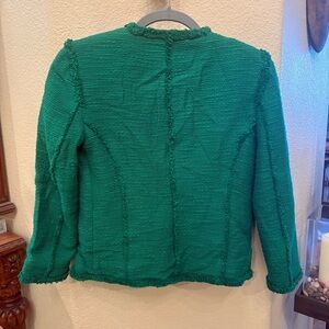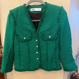Pre-owned in great condition with no rips or stains. Elevate your style with this chic green tweed jacket from Zara. Perfect for any occasion, this jacket combines elegance with comfort. Gorgeous rhinestone jeweled buttons. Has 3/4 sleeves and light shoulder pads inside. Perfect color for the holiday. Comes from smoke and pet free home.