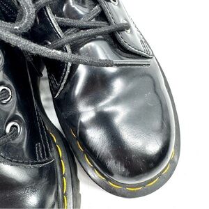 Unleash your inner rebel with these iconic DR. MARTENS Jadon 8-Eye Platform combat boots in glossy black Patent Lamper leather. An amped-up evolution of the Original 1460, this towering boot features the signature yellow welt stitching and a chunky, air-cushioned Quad sole, perfect for adding a statement edge to any outfit. The inner ankle zipper ensures effortless wear.