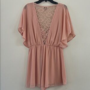 Elegant pink jumpsuit with lace detail. Features a wrap-style front and flowing sleeves.