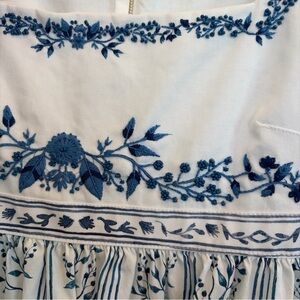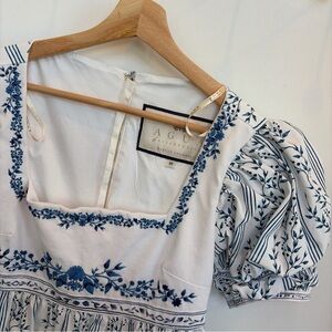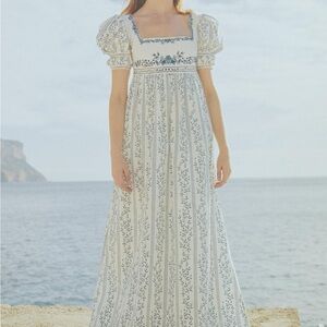 Elegant maxi dress with blue floral design. Features puff sleeves and square neckline. Perfect for stylish occasions. Original price $790 worn once to Bridgeton event. Excellent condition. Beautifully contructed square neckline, high waist, puff sleeves, Santorini Greece colors and vibes. Comes with agua hanger and moda operandi garment bag
