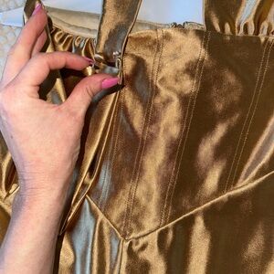 Dazzle in this strapless gold gown by Retrofete. Sleek and sophisticated design. Perfect for glamorous events. Worn once for a few hours.