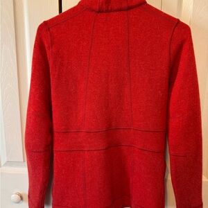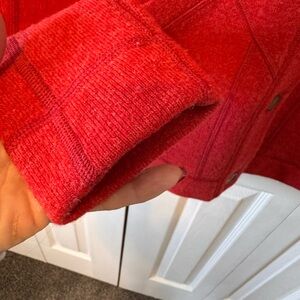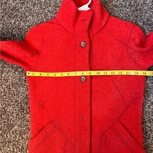 Smoke pet free home, no rips, stains or odors, cozy fleece rich red soft sweater knit exterior and brushed fleece interior for warmth, stand collar 2 front pockets , tailored fit!