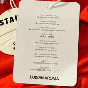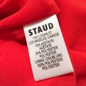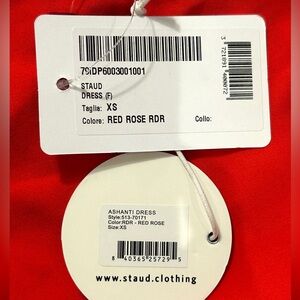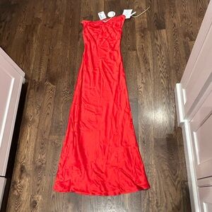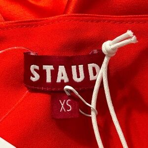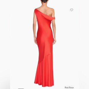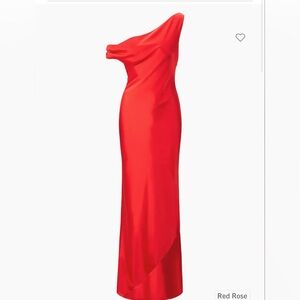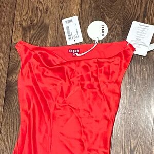 STAUD Ashanti Asymmetric Off Shoulder Red Rose Gown. Sleeveless with a drape neckline, fitted top & loose bodice. Poppy red satin color, fully lined and invisible side zipper. Size XS. Online it says this is similar to a US 4. (See measurements chart). Laying flat approximate measurements are 14.5" chest, 13" waist & 58" length. Sold on Revolve, Bloomingdales, Saks Fifth Avenue & Neiman Marcus. Stock photos included to show style & fit. Bought for a wedding & missed the return window. NWT. New Condition!
