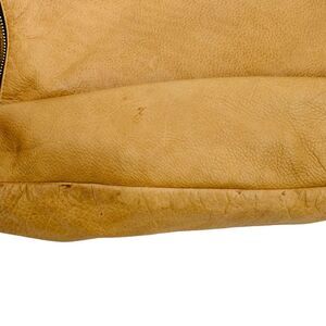 Soft buttery leather tan bag with shoulder or crossbody strap. The crossbody strap gives the look of a messenger bag. Making this bag very versatile. There is a zipper back pocket and dual front zipper with leather pulls that hang down front or to the side. Gold Hardware.