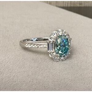 This gorgeous piece showcases a magnificent 2-carat aquamarine-colored moissanite stone at its heart, radiating a serene blue hue. It's gracefully framed by sparkling white moissanite accents, creating a dazzling display with a total carat weight exceeding 3 carats. The exceptional VVS1 D grading ensures outstanding clarity and color, and yes, it confidently passes a diamond tester, offering incredible brilliance.