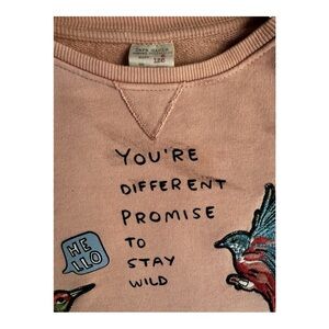 This Zara sweatshirt in a soft cream color features a playful graphic design with vibrant birds and text, offering a relaxed and comfortable fit. The full-length sleeves and crew neckline make it a versatile addition to any casual wardrobe.