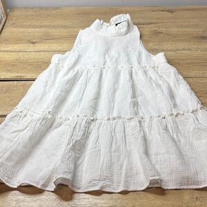 Chic white mini dress with a tiered design. Sleeveless and stylish for any outing. Has halter neckline that ties in back with slightly open back. Sleeveless, fully lined. The stock photos is not the color dress I have, this one is white. Stock photos are for reference of what it looks like on. Great condition, no stains or imperfections. Measurements are in photos