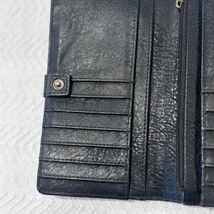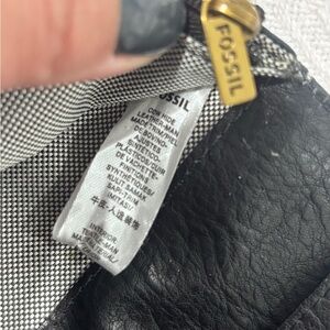 Sleek black leather wallet. Features a gold accent bar with Fossil branding. Perfect for everyday use.