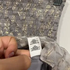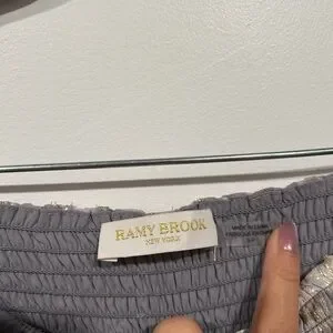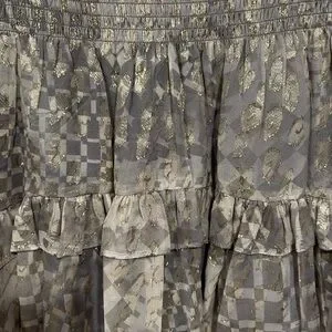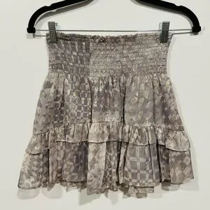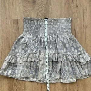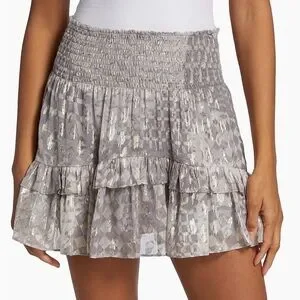 Stunning Ramy Brook mini skirt crafted from a luxe silk blend with metallic shimmer throughout. Features a flattering smocked elastic waistband and tiered ruffle silhouette for effortless movement and an elevated feminine look. Lightweight, flowy, and eye-catching — perfect for dressing up or down.