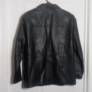 Women's Size Medium, black leather 4 button blazer style jacket from Tudor Court by Haband. lapels, hidden outside pockets, inside breast pocket, polyester lining, extra button, 22" pit to pit and 27.5" back length from shoulder. one tiny hole as shown from lapel pin. equestrian Western cowgirl rodeo ranching neutral natural fiber upscale stylish comfort coat car coat long line
