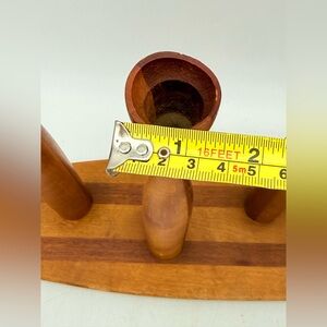 Vintage Danish modern teak candlesticks arranged on a matching base, featuring sculptural tulip forms in varying heights, classic mid-century Scandinavian design. The candlesticks wobble, I don’t know what the issue is, if they need screwing underneath or not, not sure. I don’t want to meddle with them, sold as is.