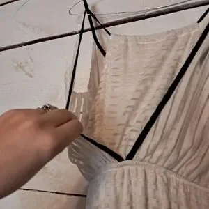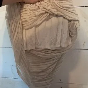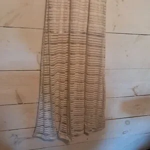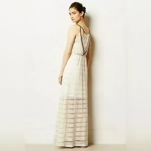 This Anthropologie maxi dress in tan off white, size small, is perfect for any occasion. The dress features a V-neckline, racerback straps, and a pullover closure. The sheer fabric adds a touch of elegance and the striped pattern makes it unique.