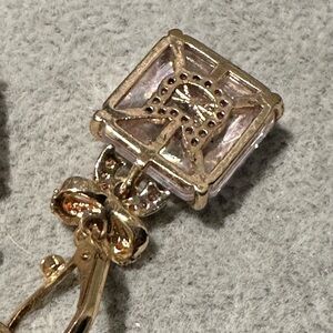 These exquisite earrings showcase a clear, square-cut crystal elegantly suspended from a gold and silver crown-like setting. The intricate design and shimmering finish create a regal and sophisticated look, perfect for any occasion.