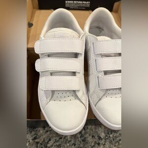DC Striker V size 6.5, white leather sneakers, Velcro skate shoes, gum sole trainers, women’s DC skate shoes