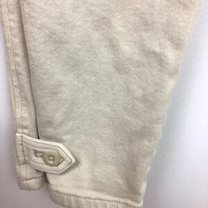 These are high-waisted utility pants with slash hand pockets, side cargo pockets and adjustable tabs at the hem. They’re made with cotton twill that has a comfortable amount of stretch. The unique colour of this pants garment dye is achieved through a special process for a dimensional, washed-down look and soft feel.