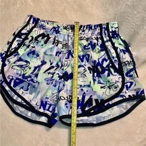 The Shorts are White with a Multicolored Grafitti Design in shades of blue and neon green. Lined with a white bikini liner for comfort and coverage. Two side pockets!