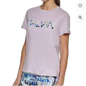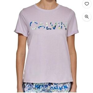 The style is “City Tag Orchid” by Calvin Klein. The Short-Sleeved Tee is a Lovely Lavender (Orchid) Color with CALVIN Text in a Graffiti Multicolored Text Design.