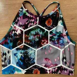 Stylish performance top by Betsey Johnson. Features a sleek multicolor honeycomb design, cross back and built in bra.