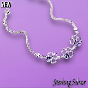 New .925 Sterling Silver Purple crystal Lucky Clover Bracelet