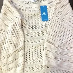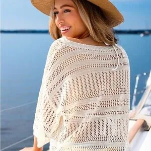 “Chic cream knit cover-up for beach days. Lightweight and stylish. Ideal for layering over swimwear.”