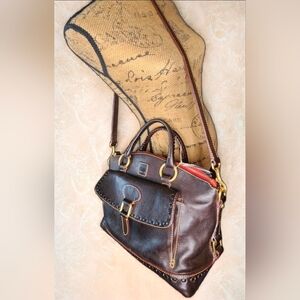 Dooney & Bourke Florentine Leather Pocket Satchel. It is made from Italian vacchetta leather in a brown shade, commonly called "Chestnut" or "Natural".