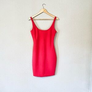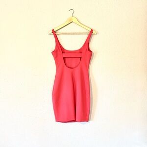 This Elizabeth and James dress is a stunning fitted sheath in a vibrant pink/coral hue. It features a classic scoop neckline in front and a sleek open-back cutout detail that adds a sophisticated, contemporary edge. Perfect for cocktail parties, weddings, date nights, or special events.