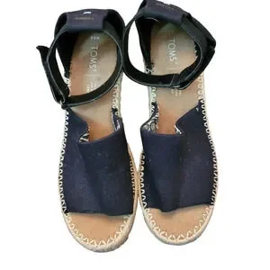Stylish Toms sandals with black straps. Tan woven wedge heel. Comfortable and chic design.