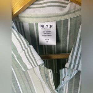 Blair, LinenBlendShirt, CottonLinen, StripedBlouse, ButtonDownShirt, GreenStripedTop, RollTabSleeves, CasualChic, EverydayTop, TravelOutfit, VacationStyle, LightweightTop, CollaredShirt, WomensBlouse, ClassicStyle, BreathableFabric