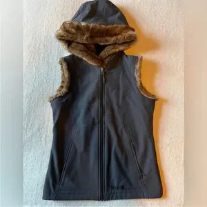 Marmot vest, dark charcoal gray and brown faux fur lined hood/ sleeves. Sz S