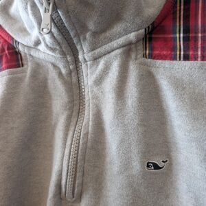 Stylish gray quarter-zip pullover featuring red plaid shoulder accents. Perfect for casual wear. In good pre-owned condition. Vineyard Vines size Large.