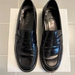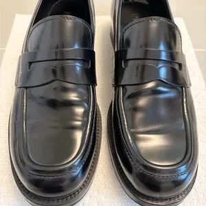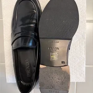 Sleek and stylish black loafers by Prada. Perfect for a polished look.