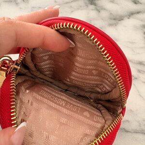 LOVE MOSCHINO red quilted coin purse. Features a gold chain and emblem. Can be used as a wallet