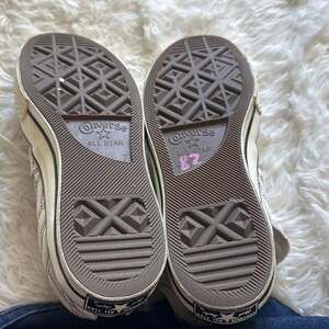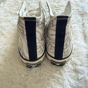 Converse Chuck 70 High Runway Cable Sneakers in Egret and Black. These high-top sneakers feature a unique cable-knit patterned upper with a fashion-forward runway aesthetic. Built on the classic Chuck 70 silhouette with a cushioned footbed for all-day comfort and a glossy egret midsole. Good pre-owned condition with wear visible on the rubber toe caps and midsoles. Laces have staining. Perfect for elevating a streetwear look with a textured, designer feel. Women’s size 9.