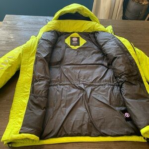 Vibrant neon green puffer jacket. Warm and stylish. Ideal for cold weather.