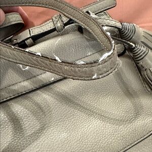 Chic taupe leather crossbody with embossed logo. Adjustable strap for comfort. Stylish and versatile.
