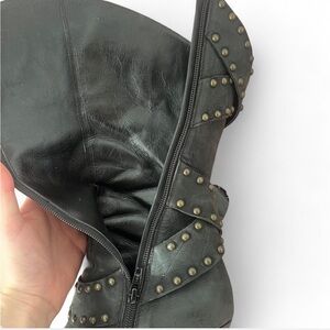 Manolo Blahnik studded strap boots with 3.75 inch heel. The caps on the heels need replacement, price reflects. Other than that they're in great condition. Sexy, fun and super flattering.