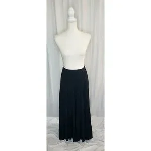 This Vintage 90s Y2K Maxi Skirt in one size fits all is a stylish and versatile piece perfect for various occasions. The black ruffle tiered design gives it a whimsical and witchy goth vibe, while the mid-rise and elastic waist make it comfortable to wear. Made from lightweight rayon fabric, this maxi skirt is ideal for all seasons and can be dressed up or down for parties, casual outings, or business events. The vintage appeal and unique accents like pleats and layers add a touch of bohemian flair to your wardrobe, making it a standout piece for any fashion-forward woman.