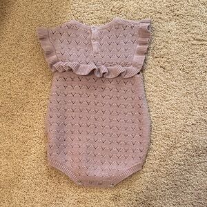 Charming lavender bodysuit with ruffle details. Soft knit fabric for comfort.
