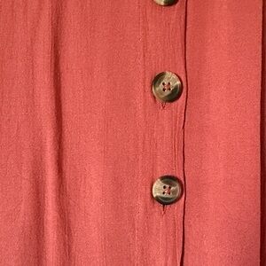 This elegant rust skirt features a stylish button-down design, perfect for any occasion. Its rich color adds a touch of sophistication to your wardrobe. 100% Viscose. Size small. 32 inches total length. Good used condition.