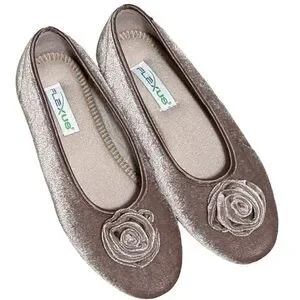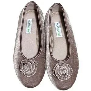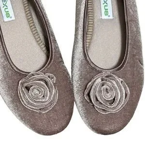 Easy to slip-on velvet-like indoor ballerina slipper with a matching color soft rose detail.