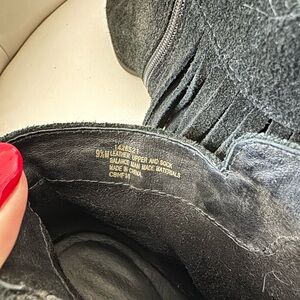 Elegant black suede boots with stylish fringe. Perfect to elevate any occasion. With a very slight gold brass accent.