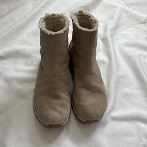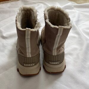 Stylish Sorel ankle boots. Soft tan suede exterior. Cozy fur lining. Durable sole for comfort.