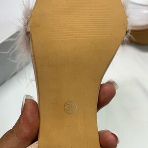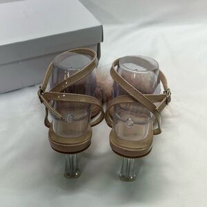 PINK FEATHERED HEELS WOMEN 7.5-8 39 PINK/BEIGE STRAPPY TRANSPARENT HEEL ELEGANT