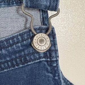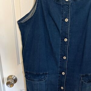 Stylish denim dress with button front. Features adjustable straps and front pockets. Perfect for casual wear.