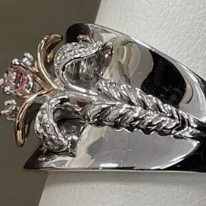 Elegant silver and gold ring featuring a beautiful floral design with a pink gemstone. Perfect for adding a touch of sophistication to any outfit. ring is a botanical or floral-themed ring, made of sterling silver with a pink gemstone accent. The design features textured leaves, with gold plating to create a two-tone effect, alongside a small pink stone set in a flower bud motif