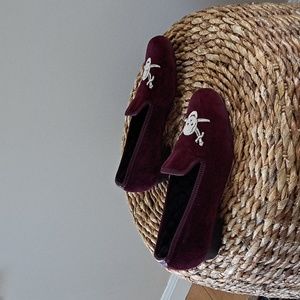 Trendy British/Paris luxury brand Shipton & Heneage women's formal/festive/holiday wine velvet smoking slippers with embroidered white skull design. Could fit a youth for a special occasion! Pre-owned and in very gently used condition. Please see pictures.