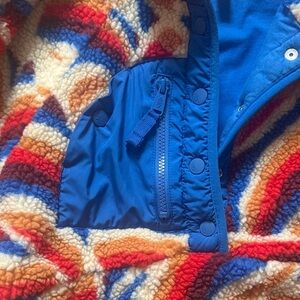 Vibrant fleece jacket with bold swirl pattern. Features a blue collar and pocket. Cozy and stylish.Bought for my daughter but has only worn a few times.