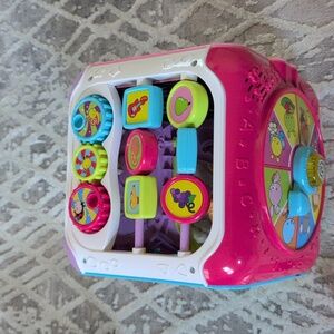 Delight your child with this colorful interactive learning cube. The bright pink and green design captivates attention and promotes early learning through engaging activities.