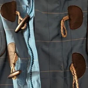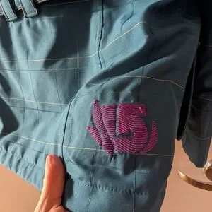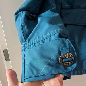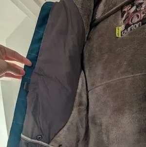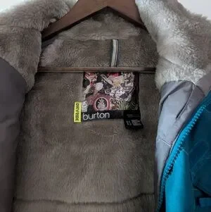 Burton DRYRIDE women's insulated ski/snowboard jacket in a bright blue graphic pattern with a gray fleece lining. Used a handful of times and is in fair condition. Due to washing, some of the trim has been damaged (see photos). There is still lots of life but it no longer fits me. This comes with a removable faux fur trim for the hood.