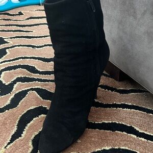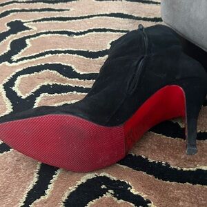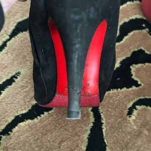 Chic black boots with signature red soles. Elevate your style effortlessly. These black suede Louboutins show signs of wear. Scuffs and small cut in suede on right heel. I would consider the condition fair, however the soles have been totally refurbished with red grip bottoms and the heel tips are in tact.They are size 9. Still good for more miles! Sanitized interior. A good purchase for a reluctant Louboutin buyer! Won’t break the bank❤️